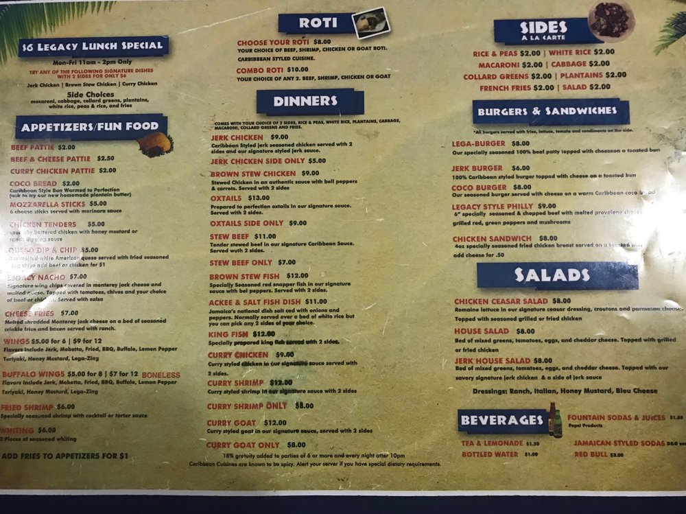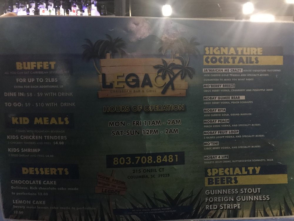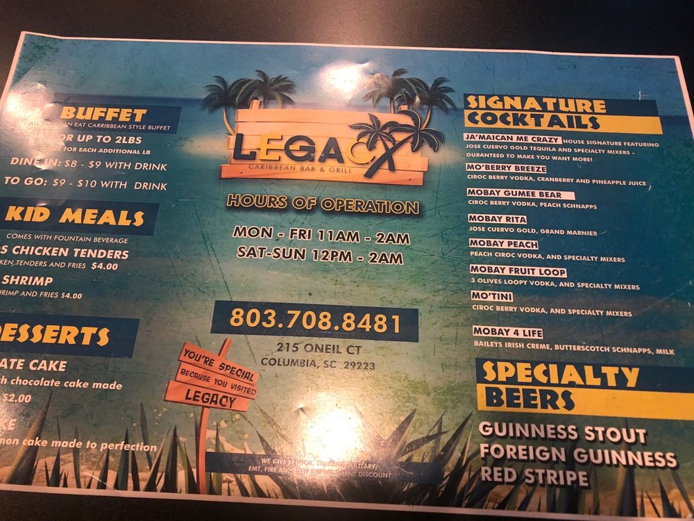 Legacy Caribbean Bar & Grill is a vibrant Caribbean bar offering a unique dining experience in Columbia, SC. The menu boasts a variety of options, including Jamaican Patties, Coco Bread, Mozzarella Sticks, Chicken Tenders, Fried Shrimp, Combo Roti, Caribbean Wrap Style Sandwiches, Traditional Wings, and Boneless Wings. The restaurant prides itself on its vegan options, wheelchair accessibility, live music, and happy hour specials on Fridays. With a full bar, outdoor seating, and pool table, Legacy Caribbean Bar & Grill is the perfect spot for a casual night out. The black-owned and women-owned establishment also offers catering services, military discounts, and compostable containers. Customers can enjoy their meal in a covered outdoor seating area or opt for drive-thru or delivery. Overall, Legacy Caribbean Bar & Grill provides a welcoming atmosphere and delicious Caribbean flavors for all to enjoy.